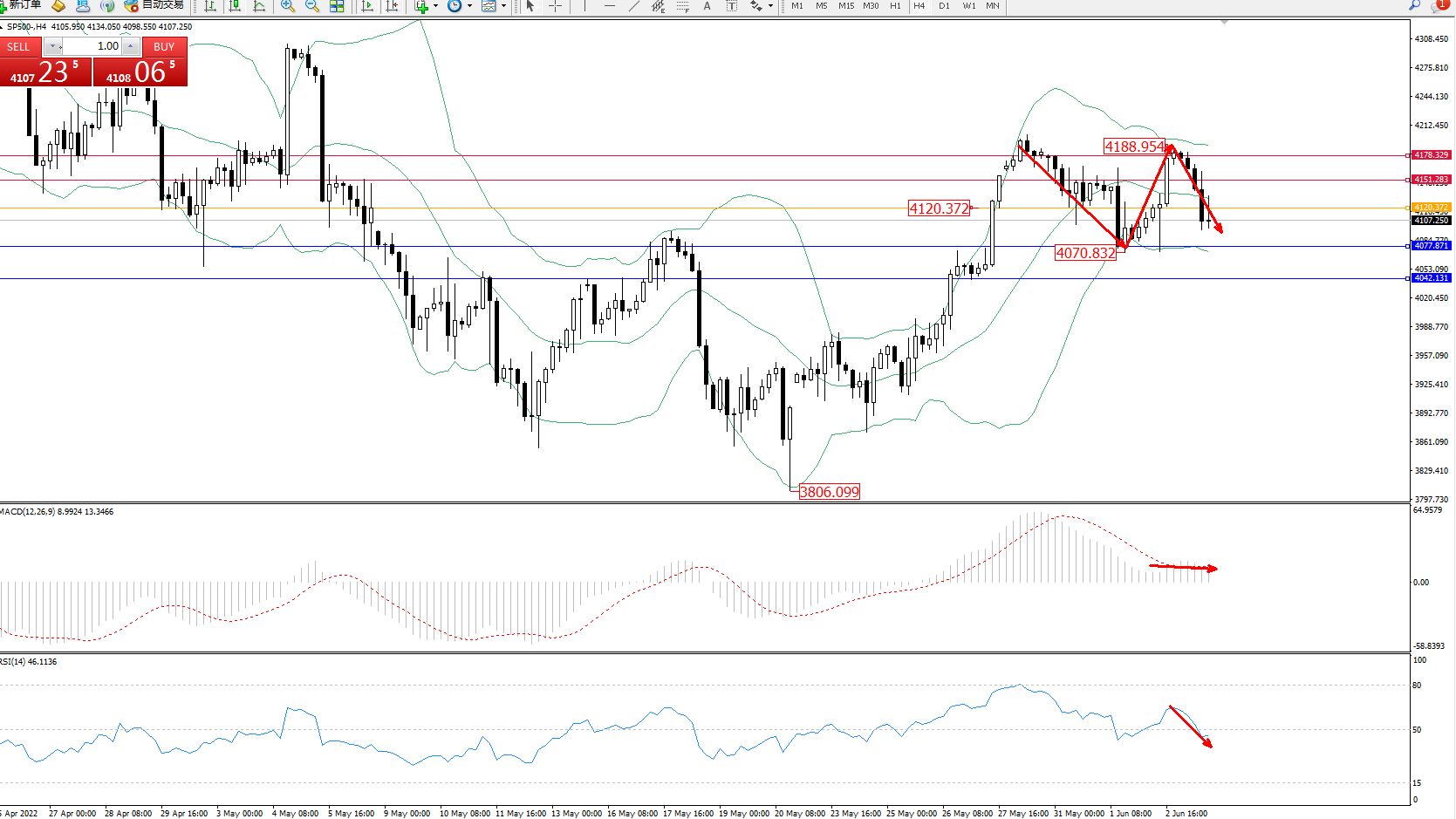 标普SP500——4小时K线图显示: