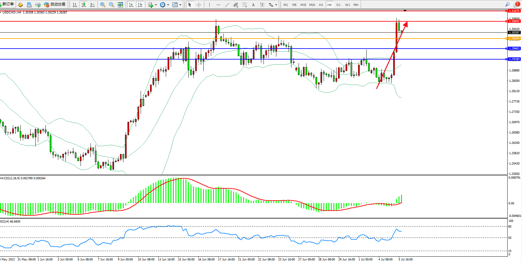 4小时图看:多头动力强势上攻,突破布林带指标上轨附近节点后高位整理,布林带指标呈张口走势持续中,MACD指标处于0轴线上方震荡上移,RSI指标处于50均衡线上側震荡上移后整理;