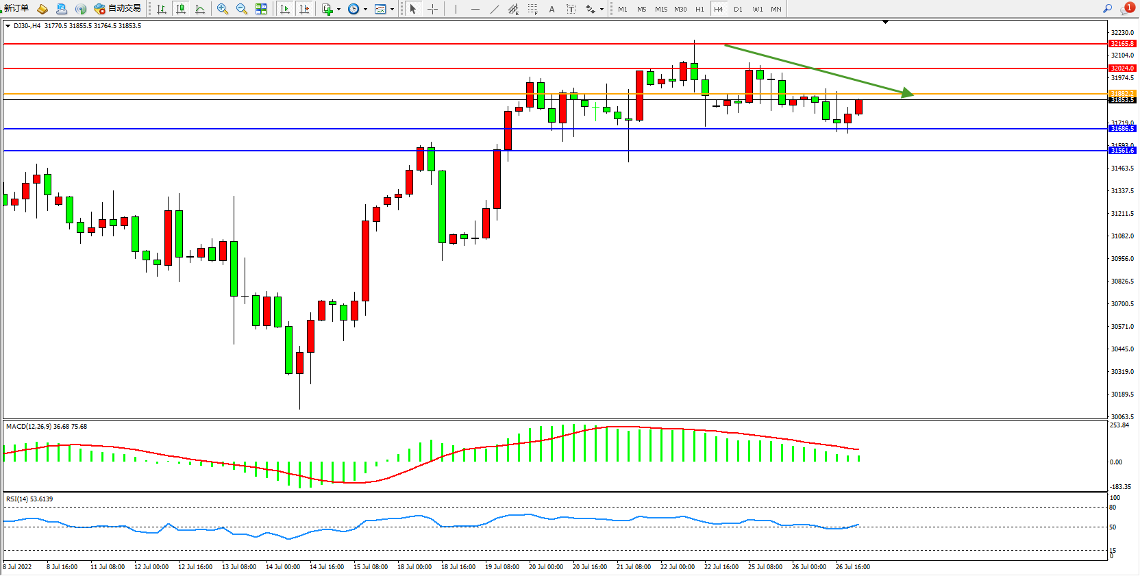 道琼斯指数DJ30——4小时K线图显示: