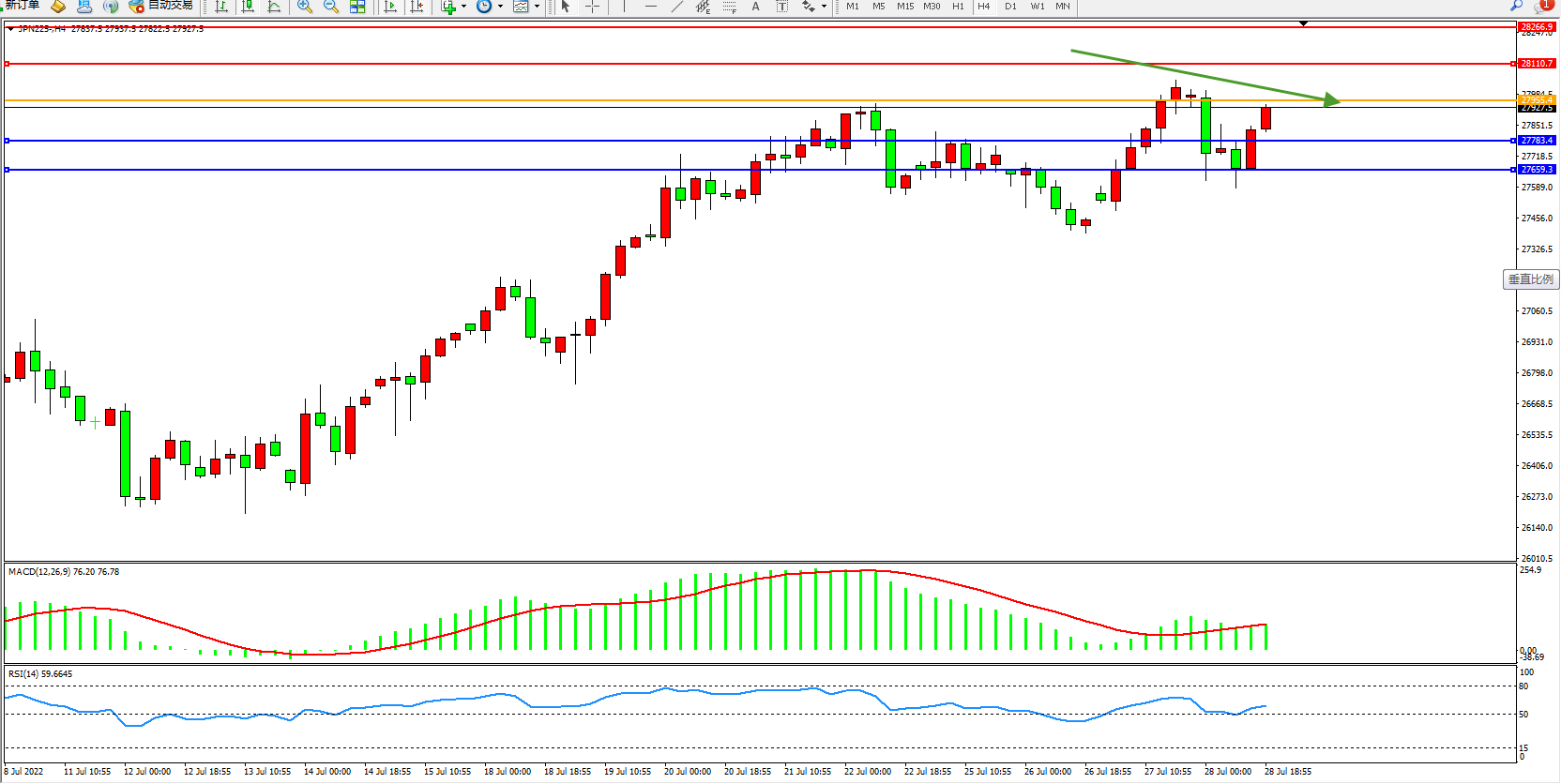 日经225指数7月28日(周四)收盘上涨91.75点,涨幅0.33%,报27807.50点。日本央行副行长雨宫正佳:希望美联储遏制通货膨胀,同时实现稳定的美国经济增长,这不仅对美国很重要,对全球和日本经济也很重要,美联储加息对日本央行政策没有直接影响,美联储的政策举措可能会对日本经济、短期价格产生各种影响。