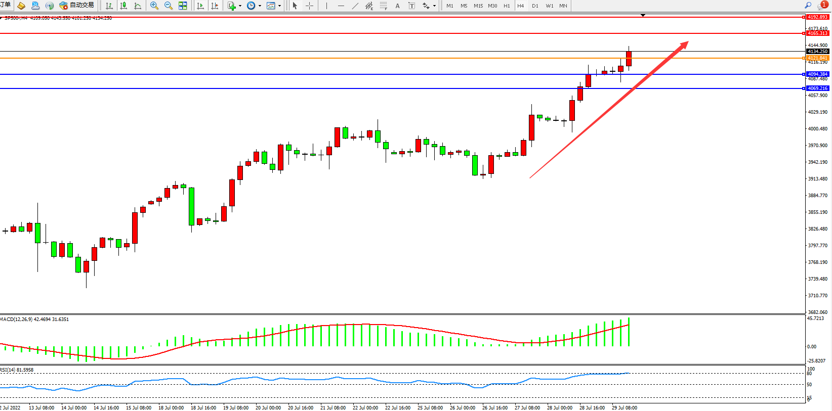 标普SP500——4小时K线图显示: