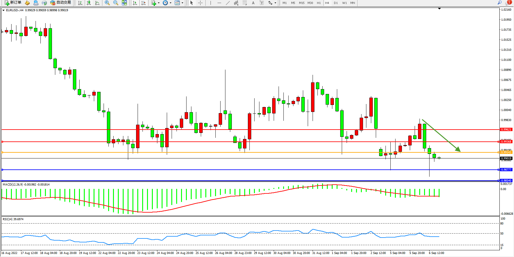 交易策略:0.99143下方看跌,目标0.98777、0.98540