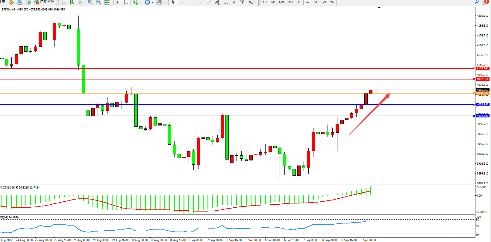 标普SP500——4小时K线图显示: