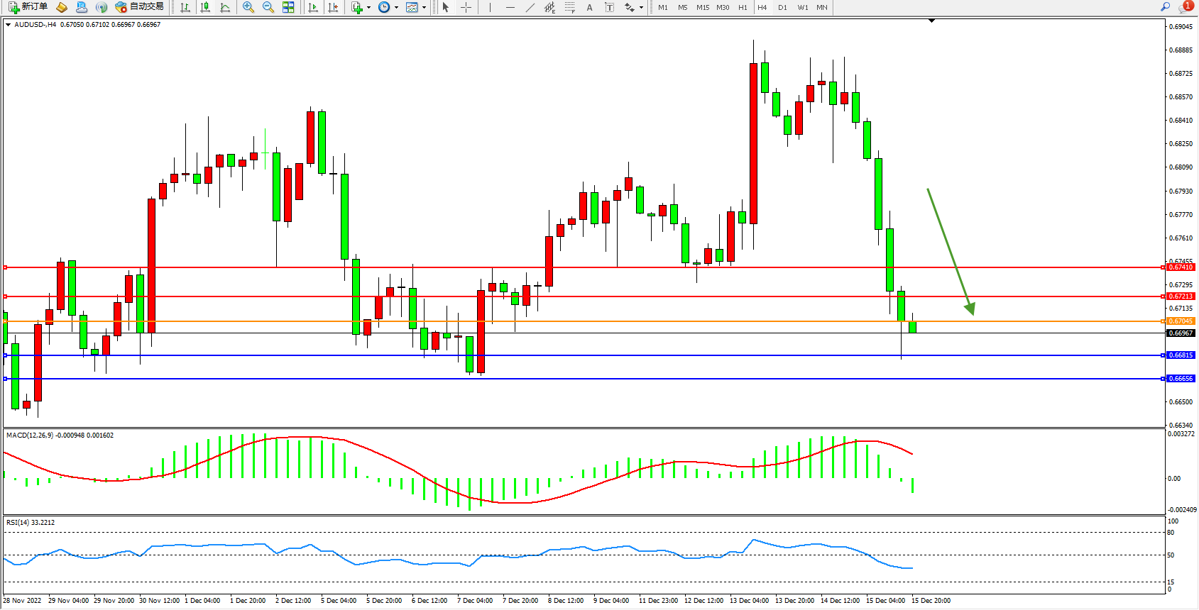 交易策略:0.67045下方看跌,目标0.66815、0.66656