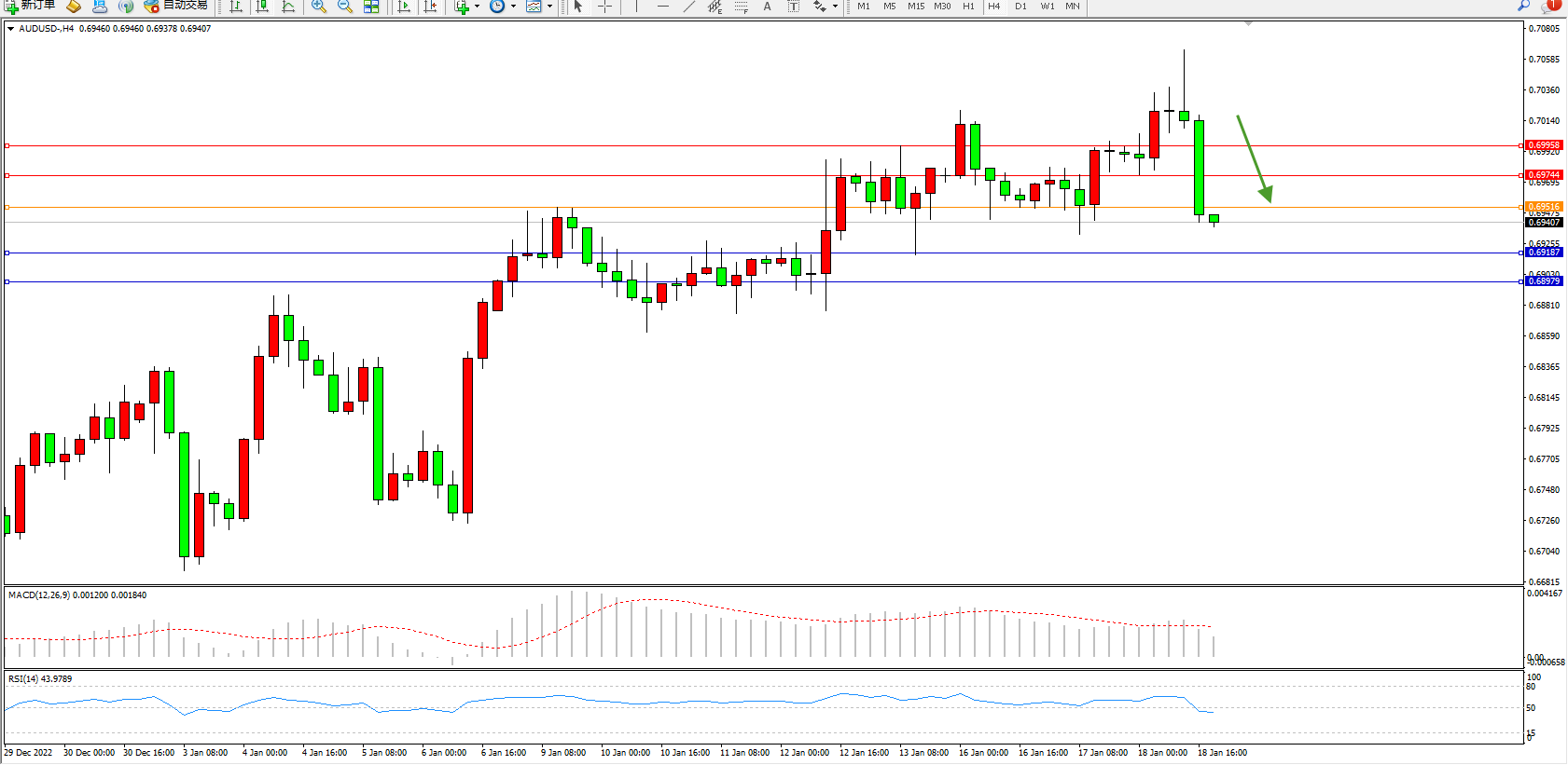 澳元美元AUDUSD——4小时K线图显示: