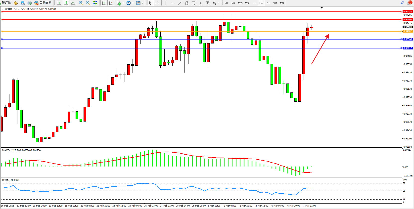 交易策略:0.94102上方看涨,目标0.94300  0.94434