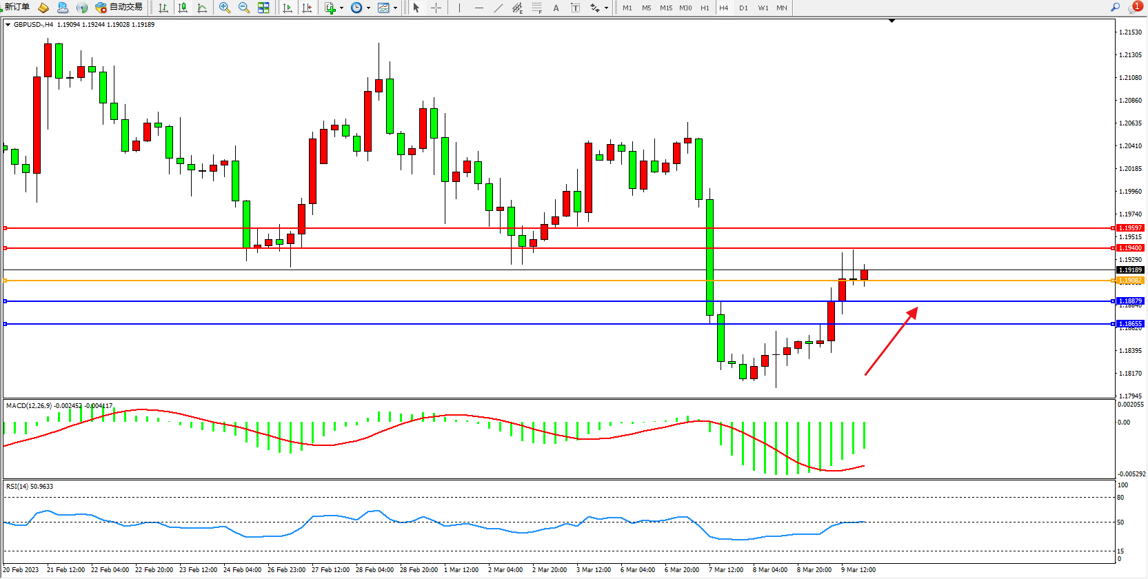 交易策略:1.19082上方看涨,目标1.19400  1.19597