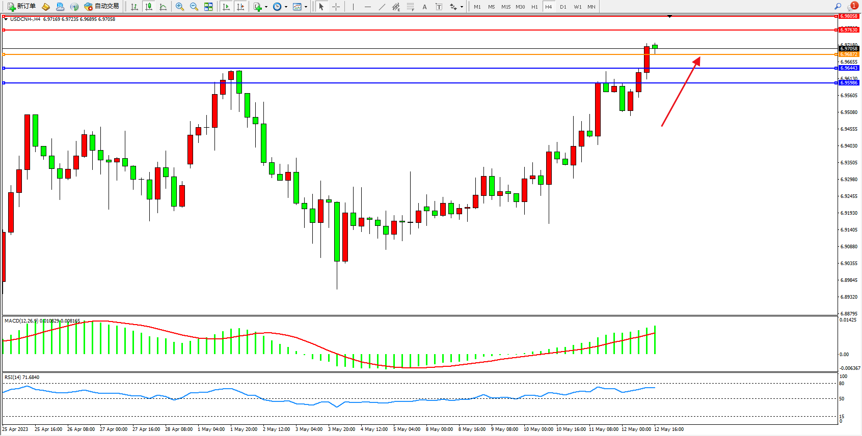 美元人民币USDCNH——4小时K线图显示: