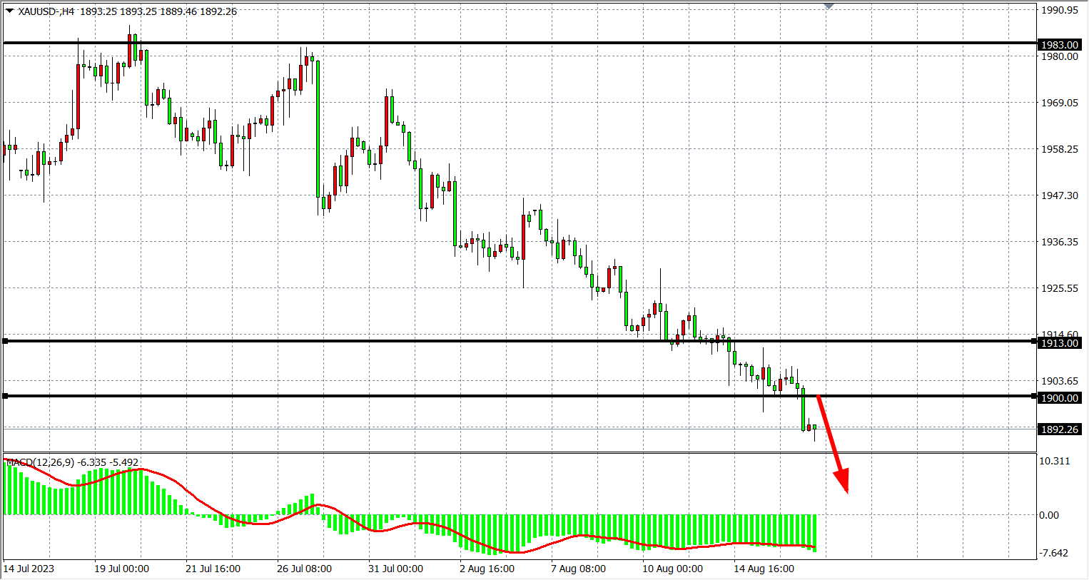 4小时图看,黄金进一步跌破1900关口,MACD量能延续零轴下放大,走势维持空头行情,阻力继续关注1900-1913附近,支撑关注下方1880-1860。
