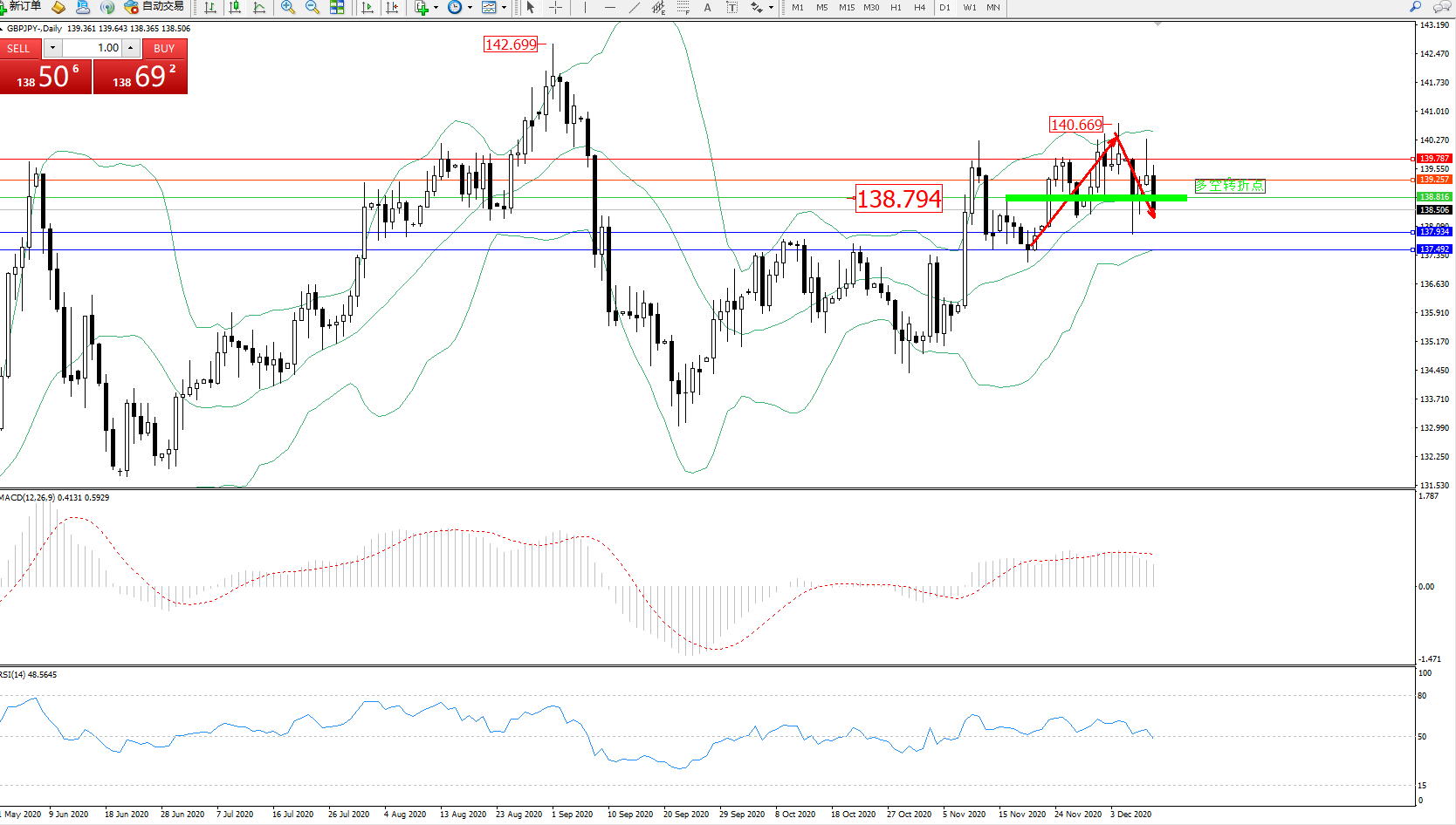 交易策略:138.794下方看跌,目标137.934、137.492