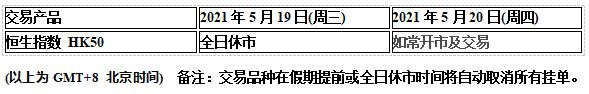 因应2021年5月19日(周三) 为香港佛诞日假期,HK50恒生指数的交易时间将于假期期间休市,敬请知悉留意!