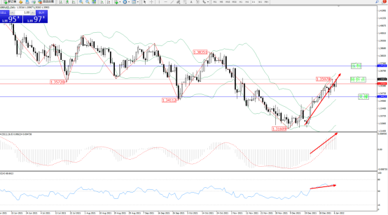 低位多头动力延续布林带指标通道中上轨区间持续震荡上扬,短期多头动力未见止步,且有继续攀升态势,布林带指标呈收口走势后开始不断上移中,上方压制关注1.37125附近,低位支撑关注1.34423位置附近,关注1.35564附近转折点,MACD指标处于多头区域维持震荡上扬,RSI指标处于多头区域维持震荡上移后开始徘徊中,如图: