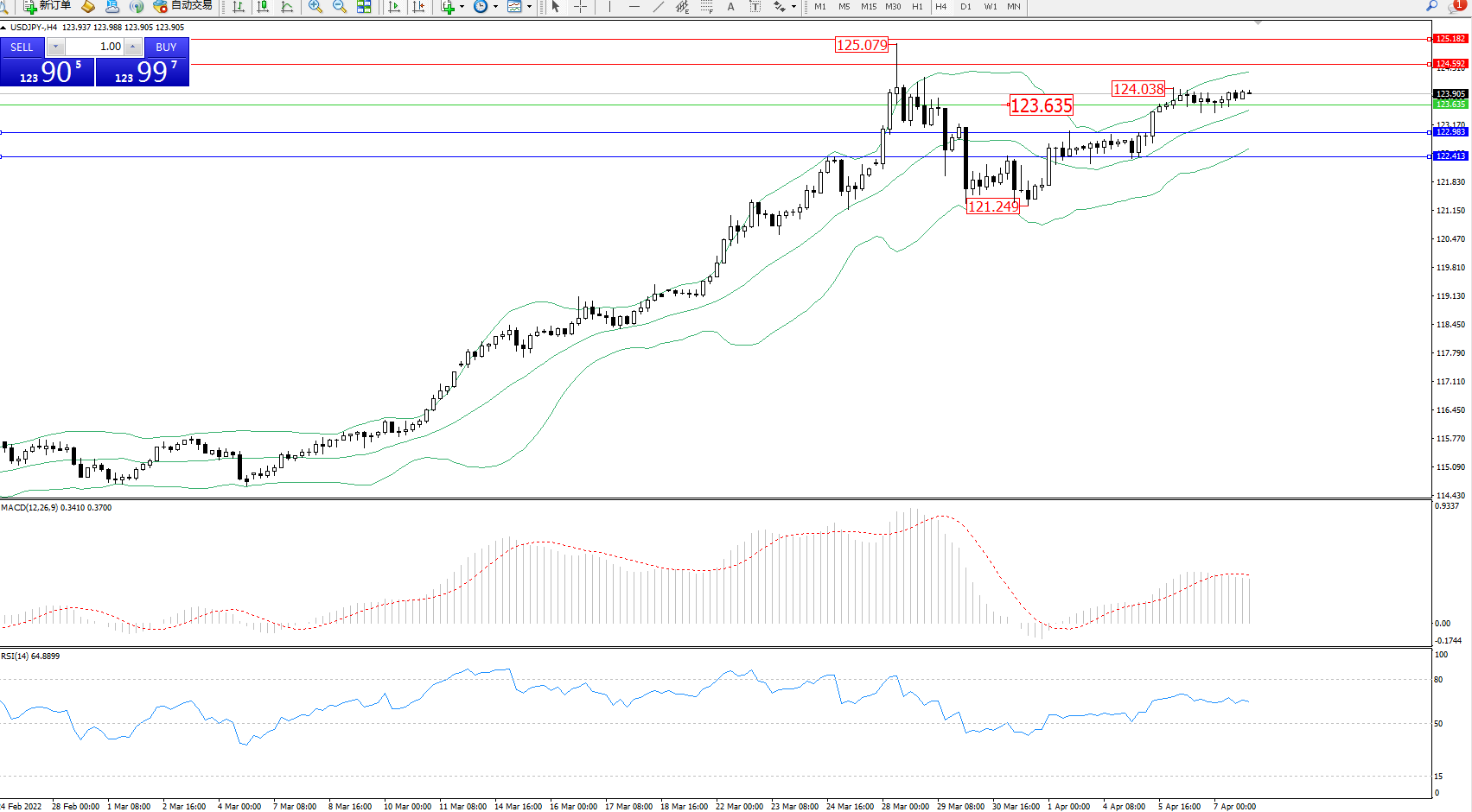 交易策略:123.635上方看涨,目标124.592、125.182