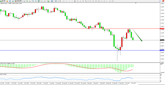 低位多头强势拉升上扬后,高位遇阻回撤,市场空头情绪笼罩,短期再度向下移动,上方压制关注1.14777附近,低位支撑关注1.07108附近,MACD指标处于空头区域维持整理,RSI指标处于50均衡线下侧徘徊;如图: