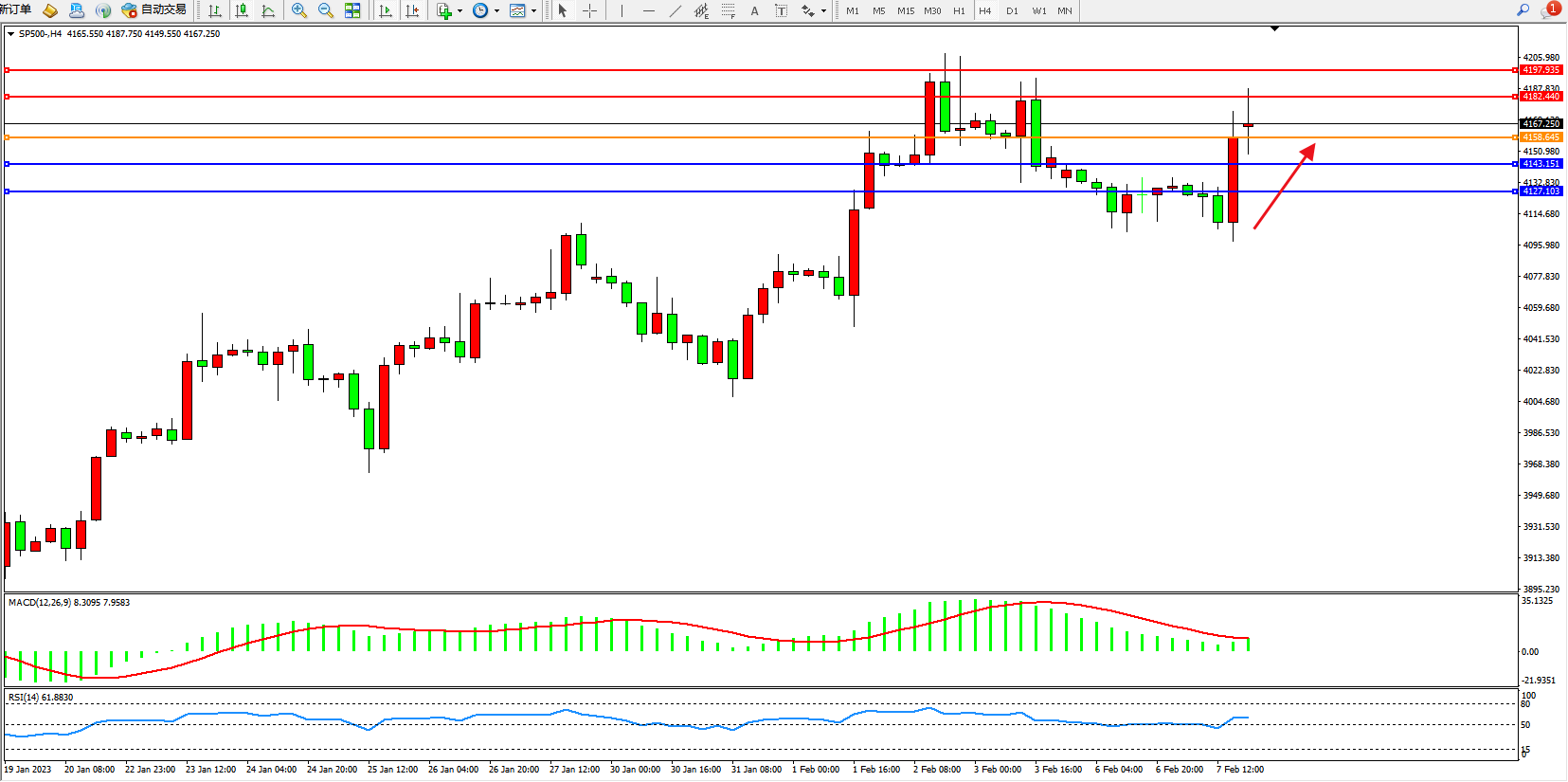 标普SP500——4小时K线图显示: